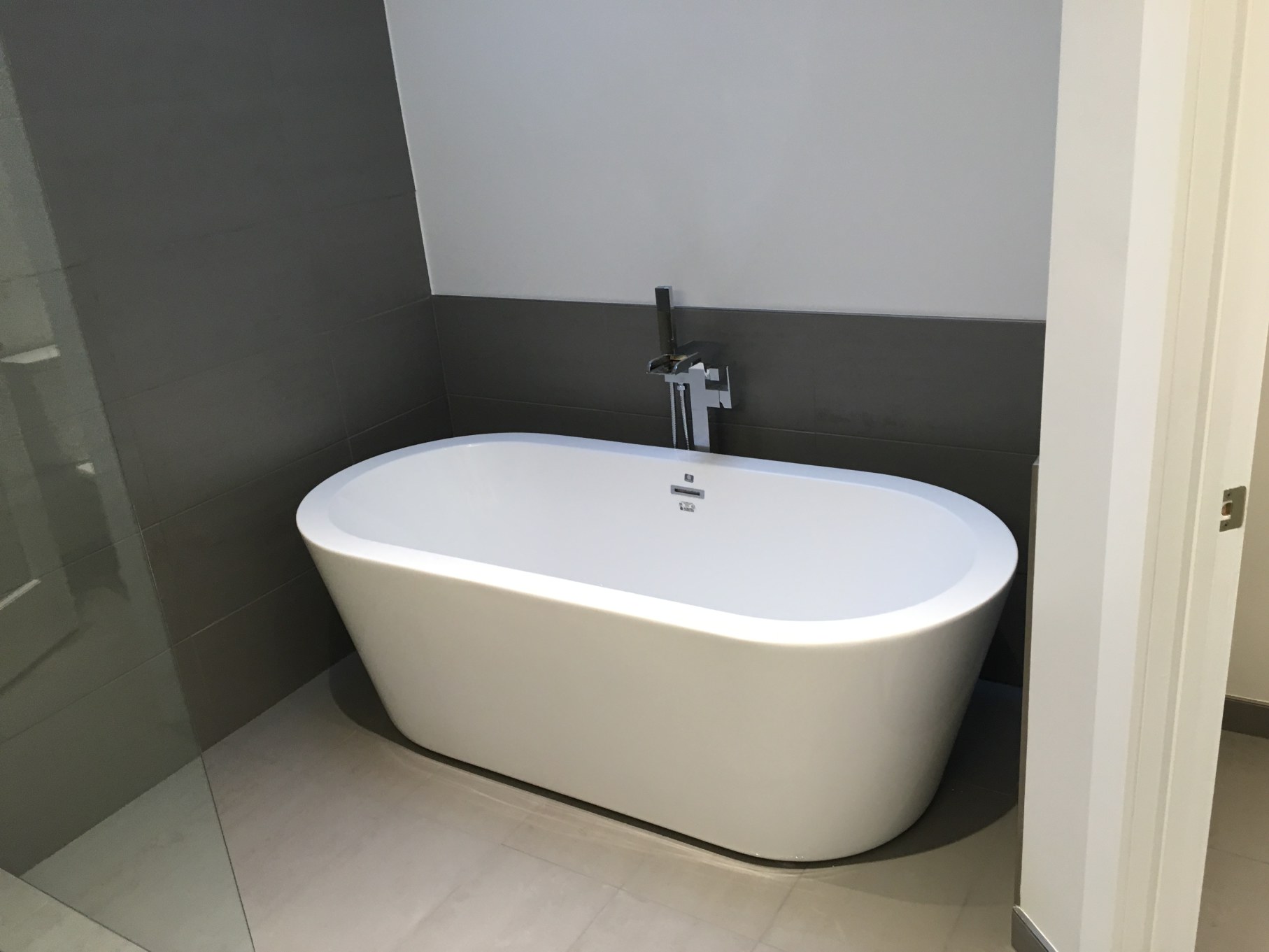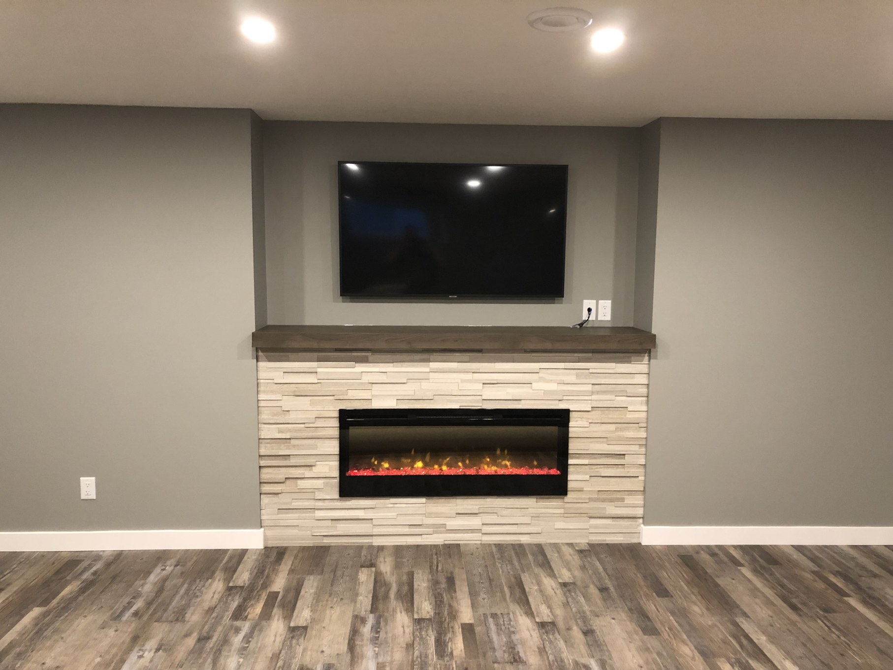 Basement development in a new build with a gas fireplace, wet bar and washroom